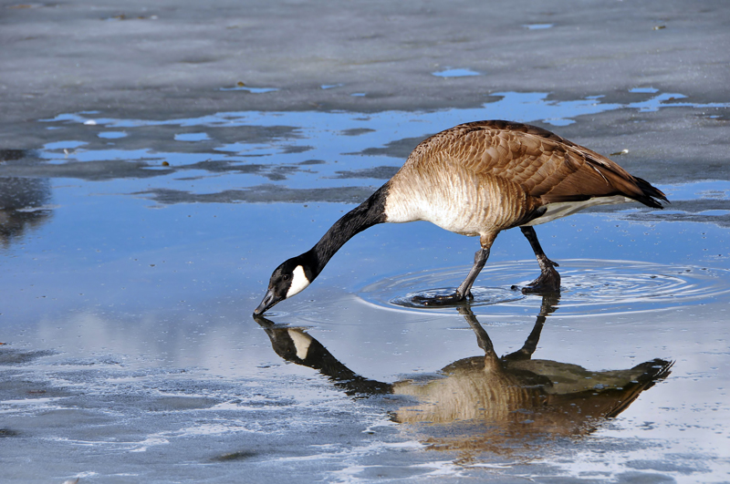 It was a balmy 65 degrees today so I headed over to the park. Smith Lake, at Washington Park, was in this semi-frozen state with alternating patches of ice and puddles. The puddles were shallow enough to act like mirrors for the geese and sky above. I took a lot of so-so pictures of the scene (like landscapes, wildlife isn’t exactly ‘my thing’). I chose this one because I liked how the puddle rings around the goose’s beak and feet give the photo a sense of movement. I can’t help but look at this and wonder how I could make it better…
