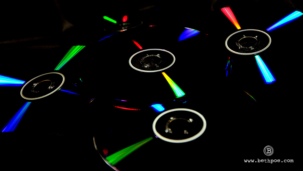 Once again I’m photographing the ‘ordinary’ trying to make it appear ‘extraordinary’. I spent virtually all day locked in front of my computer surrounded by financials, tax forms and other detritus of the accounting world. Mind numbing for sure. When I was ready to shut down for the night, it occurred to me that I hadn’t photographed anything that day. I must admit that it is hard to switch over to ‘right brain’ thinking after spending all day in the ‘left brain’, but I forced myself to look at my environment with a creative eye. I spotted a few blank CDs on my desk, and decided to arrange them under my desk lamp so that their shiny sides reflected the light like a prism. I arranged the CDs on a black blanket, and then underexposed the shot to highlight the rainbow of psychedelic colors. Groovy man….