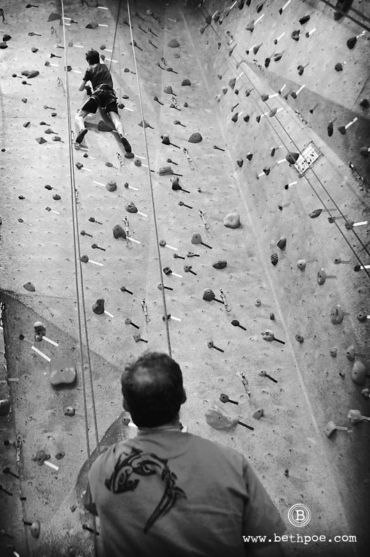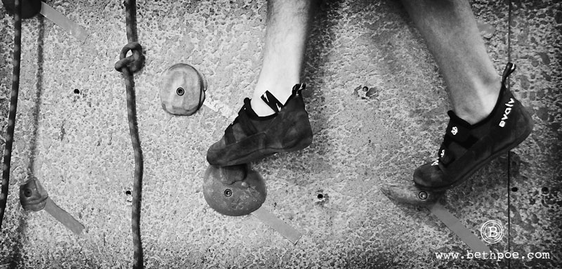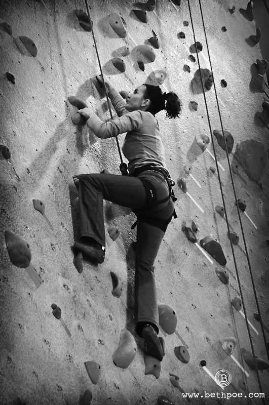 My son took up the sport of rock climbing earlier this year. He is taking classes at an indoor climbing school this winter and will hopefully have the chance to build on what he has learned this summer climbing in the Colorado mountains. Today, we had the chance to join him for a free day at the gym, so that we could try our hand at the sport. Both my husband and I have been climbing a couple of times before, and we both consider ourselves physically fit – I am a runner, he is a cyclist, and we both do hot yoga several times a week. But today we were reminded how challenging the sport of rock climbing is. Not only does it require strength and flexibility, it also takes an enormous amount of mental focus. While climbing, I found myself so preoccupied with planning my route and problem solving my next move, that I hardly noticed how hard my body was working. For me, that was a real hook. I can certainly see how people become addicted to this sport.