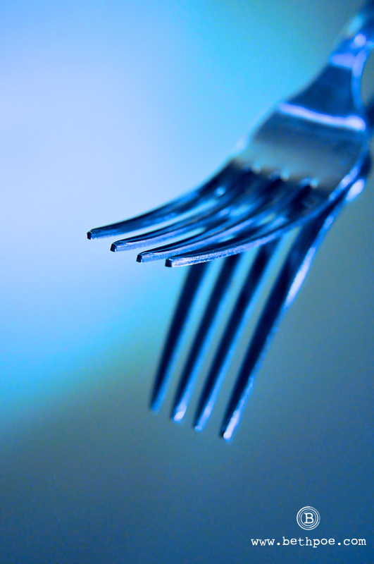 In a photography class I took several years ago, the instructor challenged us to take an everyday object and photograph it 30 ways.  Those were the only instructions – the rest was up to the individual student.  That assignment was my first exercise in learning how to see things with fresh eyes and how to use varying perspectives to present a single subject.  Take for example the fork that I chose to photograph tonight.  Here is an object that we all use every single day with hardly a second glance at the relative beauty of this utensil.  Through photography, I am able to draw the eye to the soft shimmer of the metal, the gentle curve of the tines, and the unique patterns formed by this very utilitarian object.