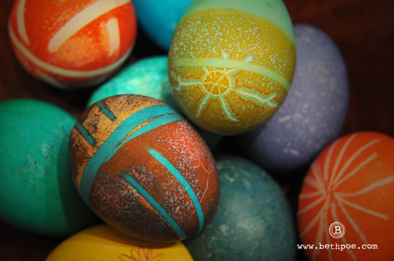 We’ve never been much for traditional Easter egg colors in my family. Sure we start off with the basic vinegar-based egg dyes like everyone else, but by the time we are finished dunking and wrapping and mixing and fussing, our Easter eggs never look quite like the classics. I guess this is one way we like to express our individuality.