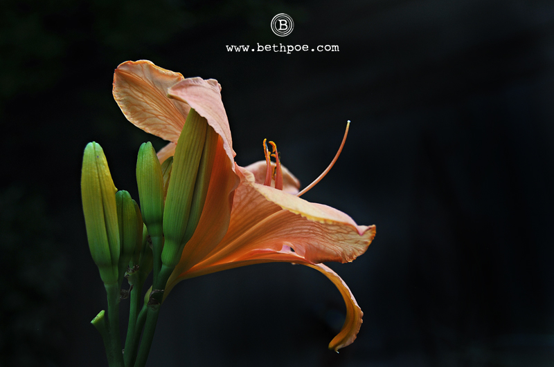 The daylilies in my garden are blooming with flamboyant peach flowers atop long graceful stems.  It is such a shame that each bloom only lasts for a day, but I suppose it is this fleeting beauty that makes them all the more special.  I set out today to capture the beauty and grace of these garden gems.