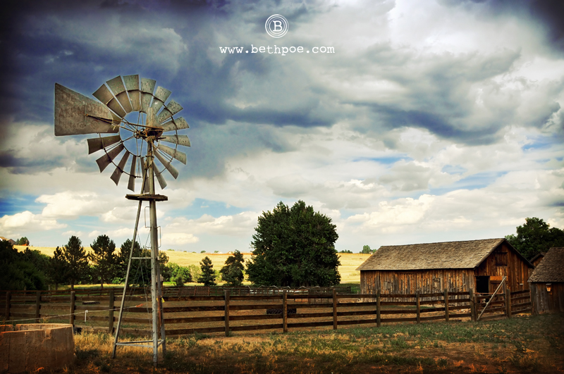 Late this afternoon I visited the Denver Botanic Gardens at Chatfield, which is located several miles south of Denver.  This was my first visit to these gardens, and I must say that I discovered quite a gem!  This location is actually a working farm nestled along the banks of Deer Creek, just a stone’s throw away from the foothills.  For a mere $5/car entry fee, you can step back in time to circa ‘Little House on the Prairie’ days and relish in the beauty of a bygone era.  There are ponies, goats and chickens; dilapidated barns and old farm equipment; …even an old schoolhouse.  What a treasure!