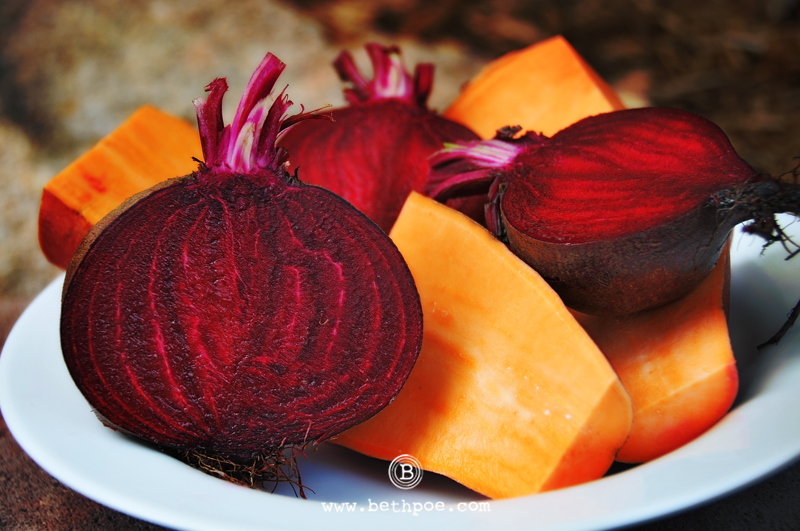 Today was one of those days when I had not a single creative idea for what to photograph. Then, I started dinner preparations and I was saved by the lowly beet and the humble sweet potato. These two vegetables are rock stars of the vegetable world, and yet from the outside they appear to be simply the ugly step sisters. It is no wonder most people never give these vegetables a chance considering their dirty, mottled and downright unappetizing exteriors. It makes me wonder whatever inspired that first early human to take a bite. What a surprise it must have been to discover the incredible beauty that lies just beneath the surface.
