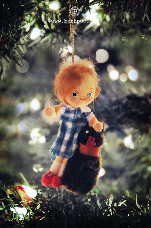 Every single ornament on our Christmas tree has a story behind it and I absolutely cherish them all.  A few of the ornaments on our tree date back to my husband’s and my childhoods.  My personal favorite from my childhood is the little Dorothy from the Wizard of Oz ornament that is featured in my photo above.  She is a little worse for the wear after so many years and has lost most of her hair.  As such, she was lovingly given the nickname ‘Chemo Dorothy’ by my sisters back when I was in high school (awful, I know).  Nevertheless, she always gets a prime spot on the Christmas tree despite her bedraggled appearance.