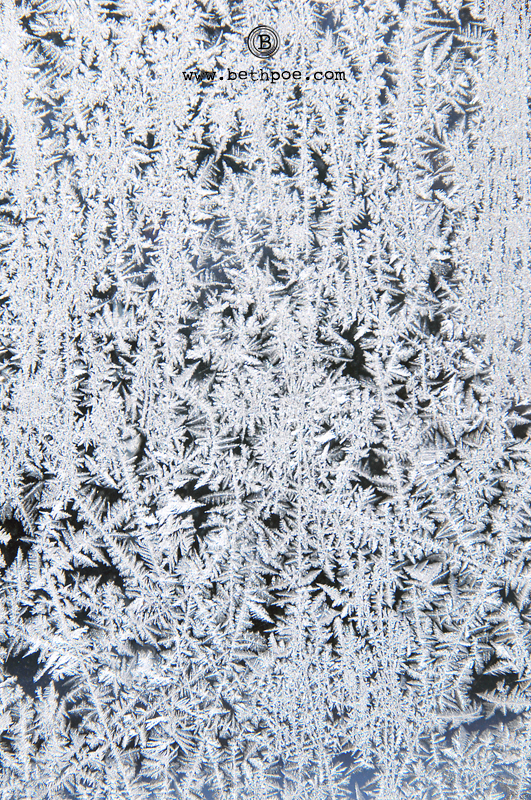 Old Man Winter has been making a bold statement the past few days. The low last night was -15 degrees fahrenheit, and the high today only 10 degrees (that’s -26 and -10 degrees to you metric minded followers). Brrrrrrrrrrr. When it gets this cold, we are guaranteed a wonderful display of frost on our garage window. The intricate patterns are a miniature art display, hand painted by Mother Nature.
